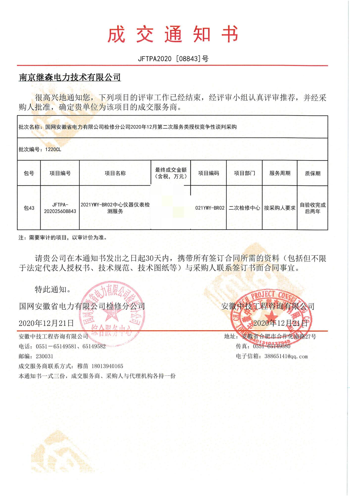 安徽省检2020年12月第二次服务类授权竞争性谈判采购-成交通知书