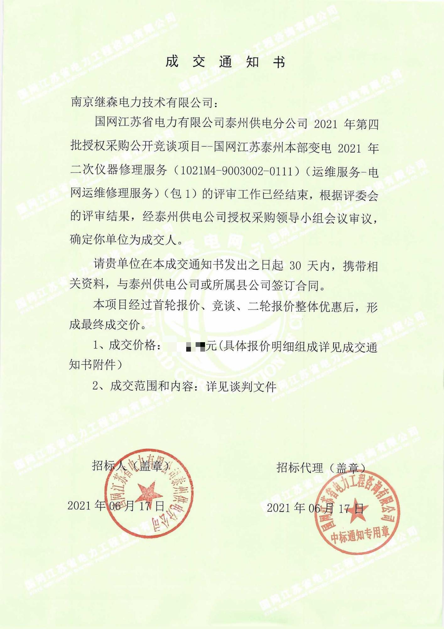国网江苏省电力有限公司2021年第六次物资招标采购-中标通知