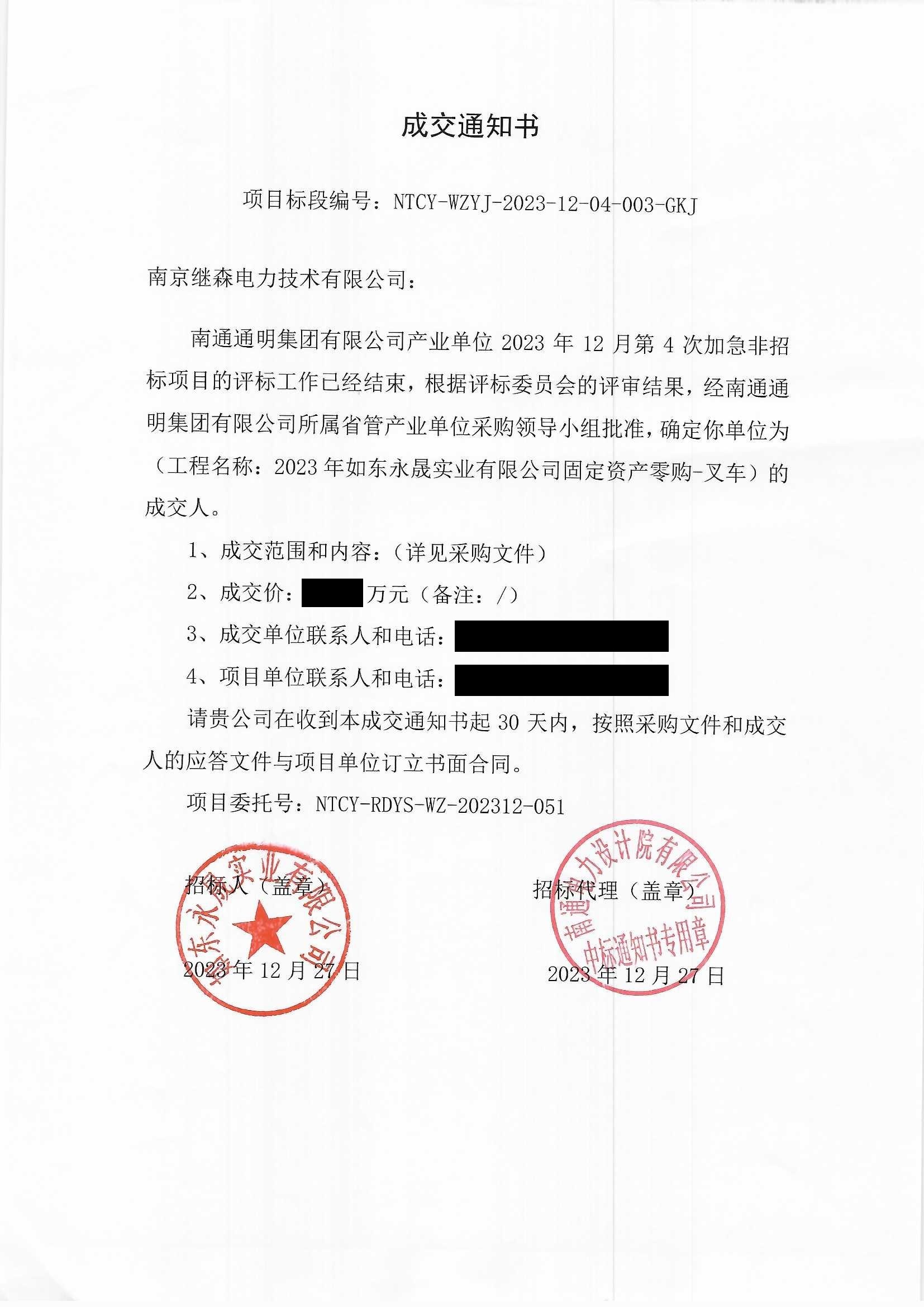 南通通明集团有限公司产业单位2023年12月第4次加急非招标项目-中标通知